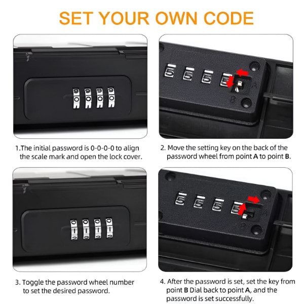🔒 Seiful oferă securitate rezistentă la șocuri, impermeabil, cu o blocare fiabilă cu combinație de 4 cifre pentru o liniște sufletească completă.